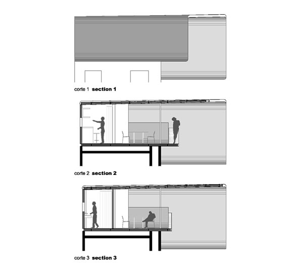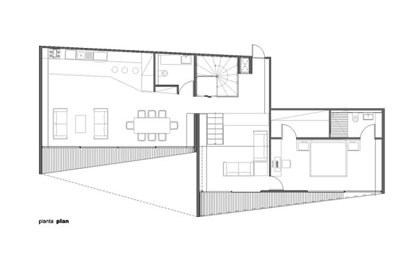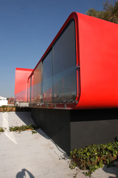 El departamento se separa en dos medios niveles, (público y privado) el primero por el cual se accede contiene sala, comedor, cocina, 1/2 baño y un montacargas que va desde la entrada, bajando medio nivel esta la sala de T.V. y después la recamara principal con baño y vestidor. Tomando en cuenta la azotea donde esta situada este nuevo cuerpo, esta es aprovechada como una gran terraza y utiliza los domos existentes de la casa original convirtiéndolos en bancos de acrílico luminosos.