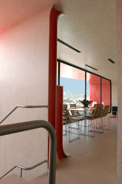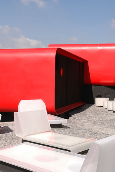 Tomando en cuenta la extraordinaria mano de obra Mexicana, la estructura esta hecha de IPR’s de 6” rolados, la cubierta es de placa de acero de 5mm que fueron cuidadosamente hojalatedos como si se tratara de un barco o nave especial por debajo de esta placa van dos capas de 1 1/2” de lana mineral actuando como aislante acústico y térmico, finalmente el interior es cubierto con OSB (triplay de astilla gruesa) de 9mm con un acabado en resina blanca deslavada